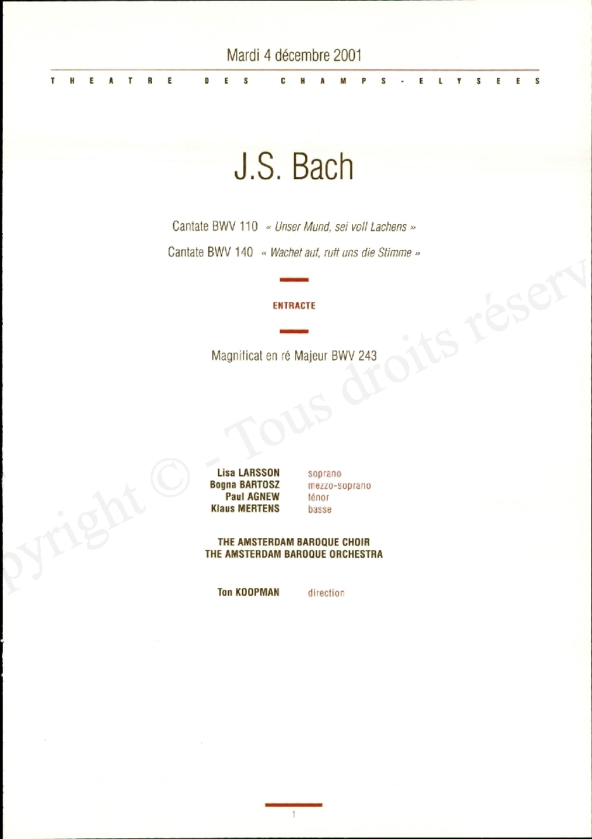 Accueil / Programmes / Bach~~Lisa Larsson~~Bogna Bartosz~~Paul Agnew~~Klaus Mertens~~The Amsterdam Baroque Choir~~The Amsterdam Baroque Orchestra~~Ton Koopman