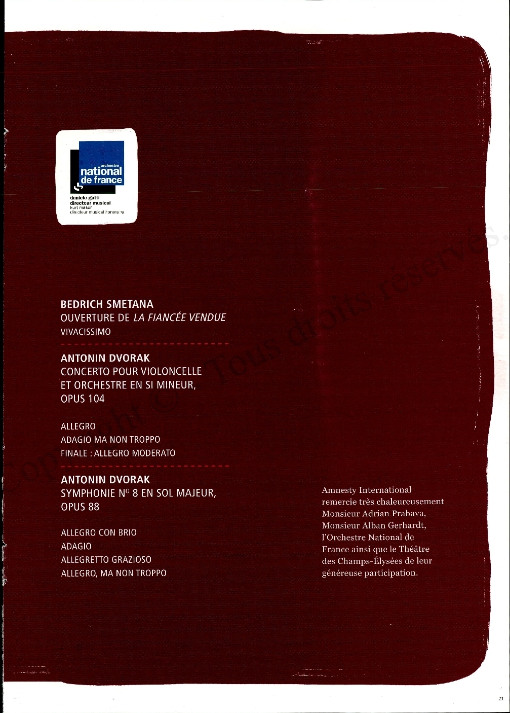 Accueil / Programmes / Le 16ème Gala musique contre l'oubli d'Amnesty International~~Orchestre National de France~~Daniele Gatti